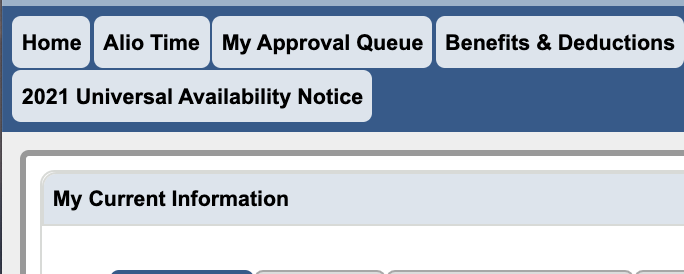 alio Time can be accessed directly from the Employee Portal. alio Time is a tab on the top navigation bar