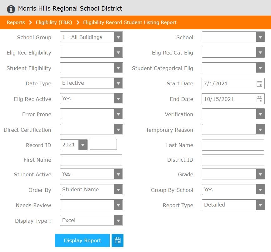 - Once you are logged in, please go under Reports > Eligibility (F&R) > Eligibility Record Student Listing Report [Eligibility (F&R)]