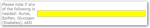 Please note if any of the following is needed: Nurse, EpiPen, Glucogen (Diabetes), AED (Free Form Entry)